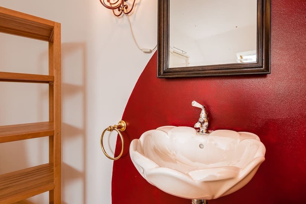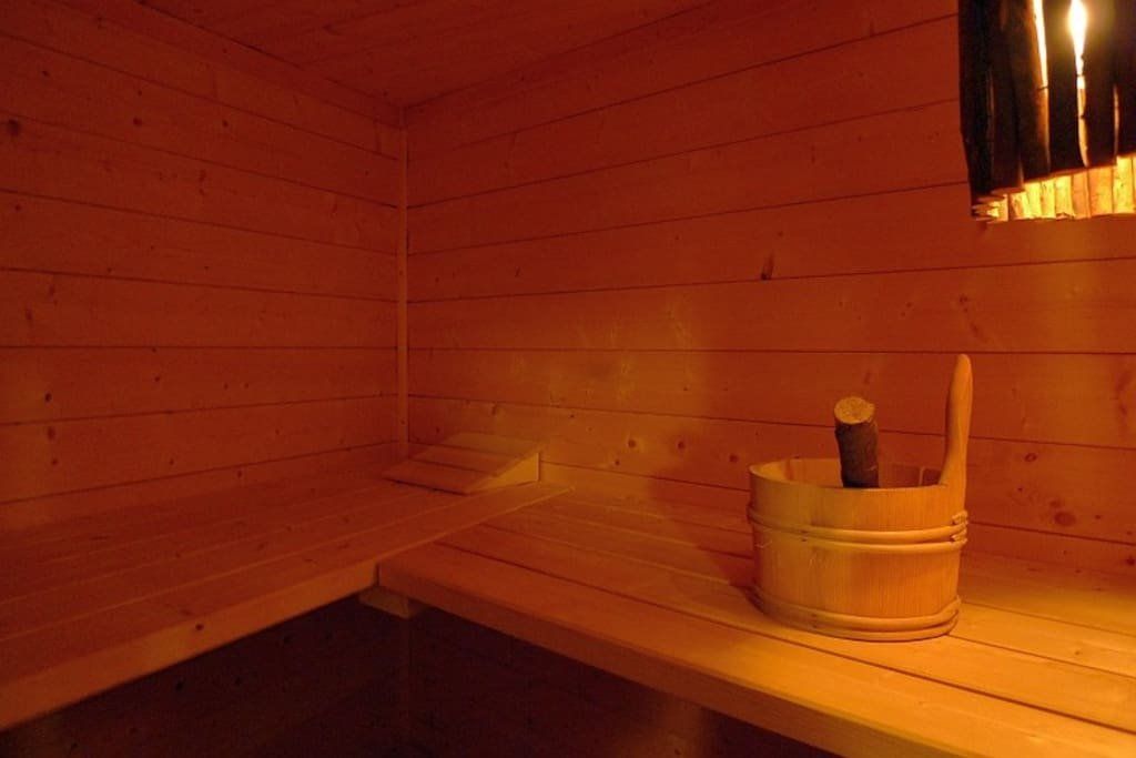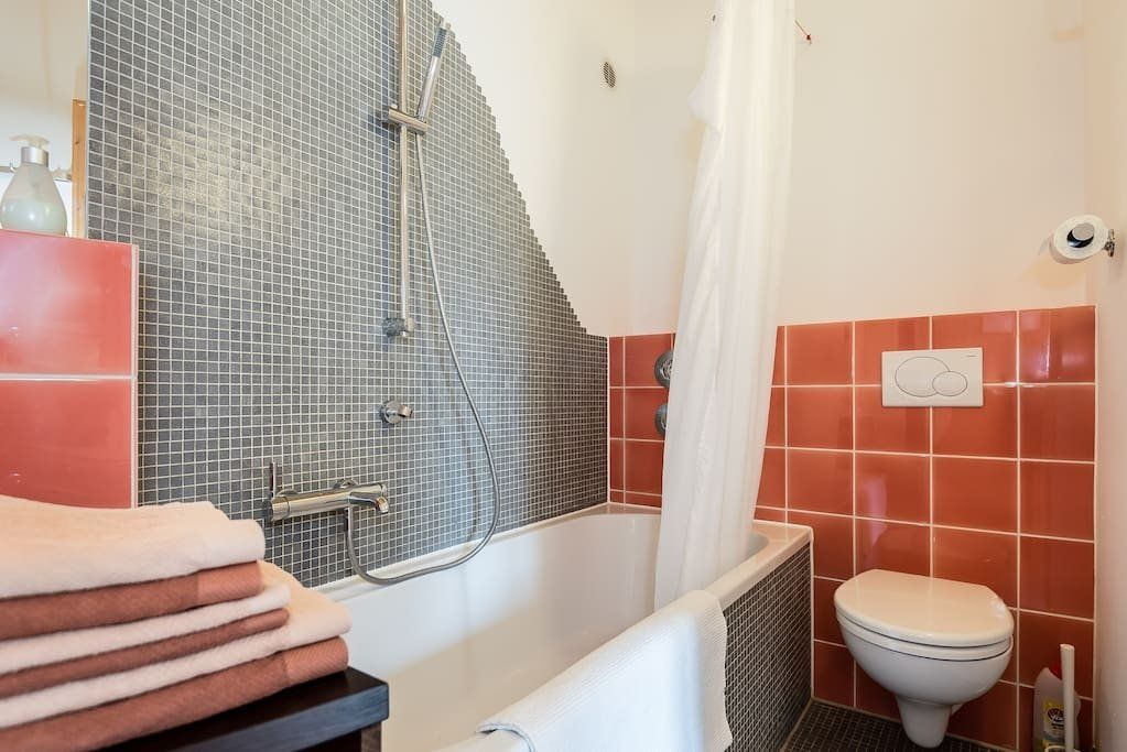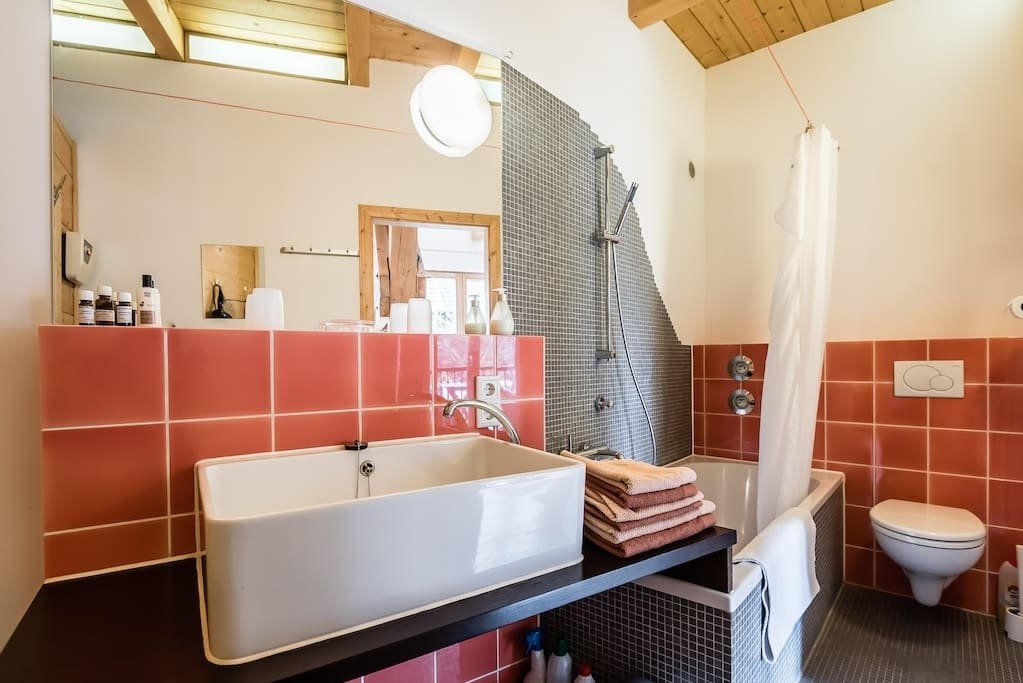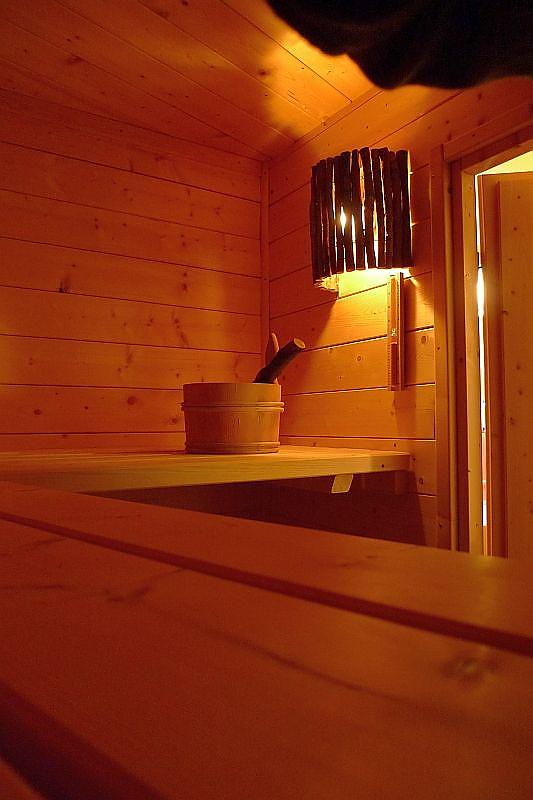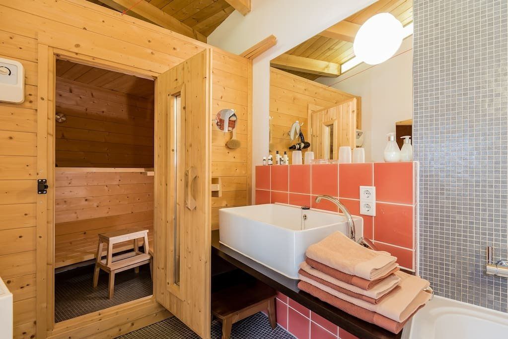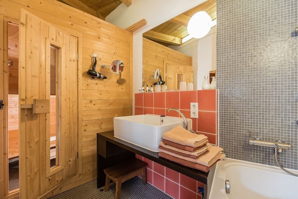 Im Bad finden Sie eine Badewanne und die Sauna. Es gibt eine großes Waschbecken und ein WC.