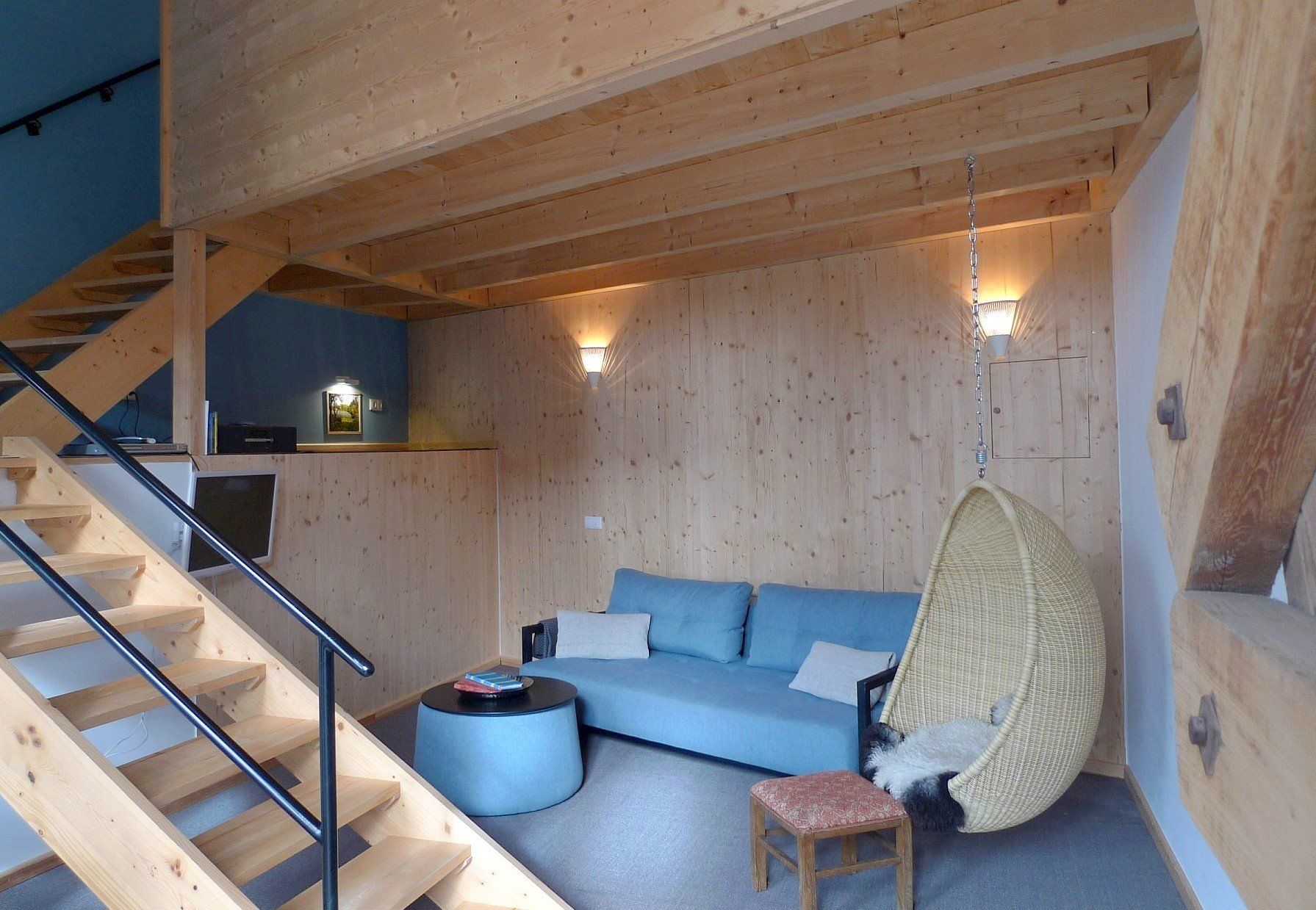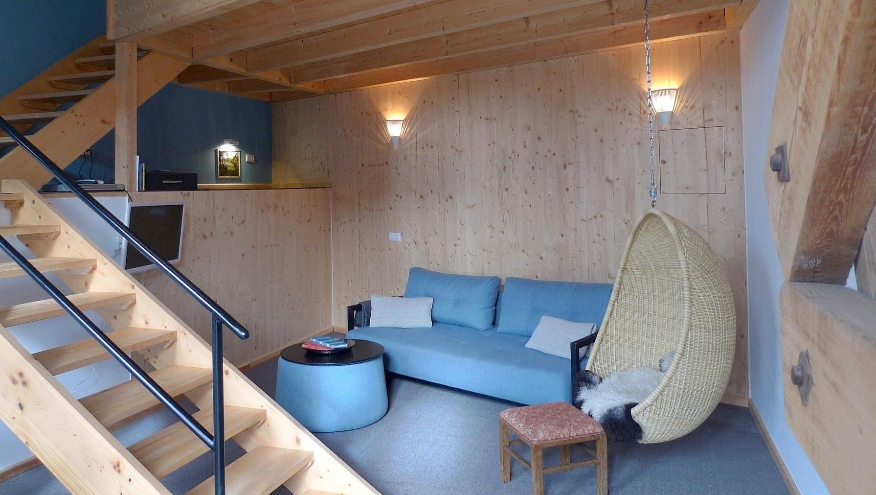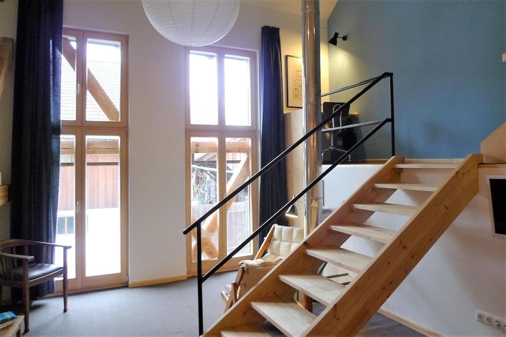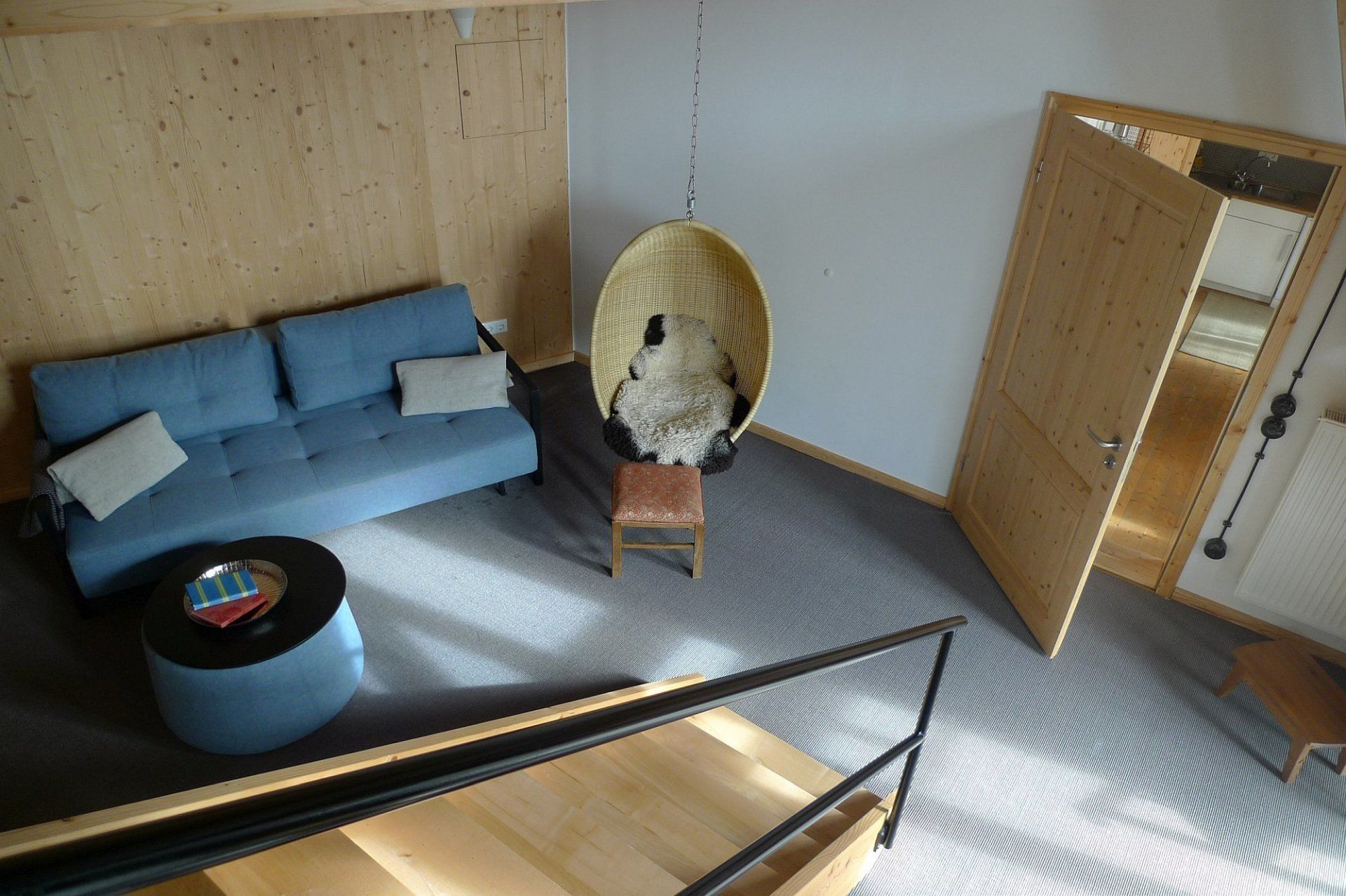 Das Wohnzimmer ist zweigeschossig. Zur Schlafgalerie hoch führt eine offene Treppe.