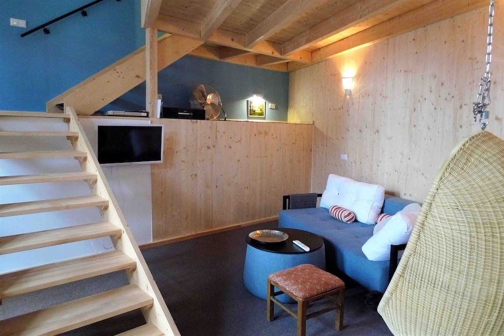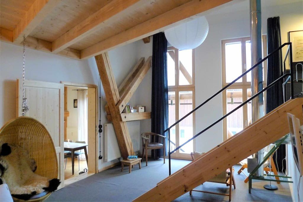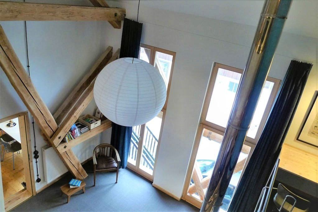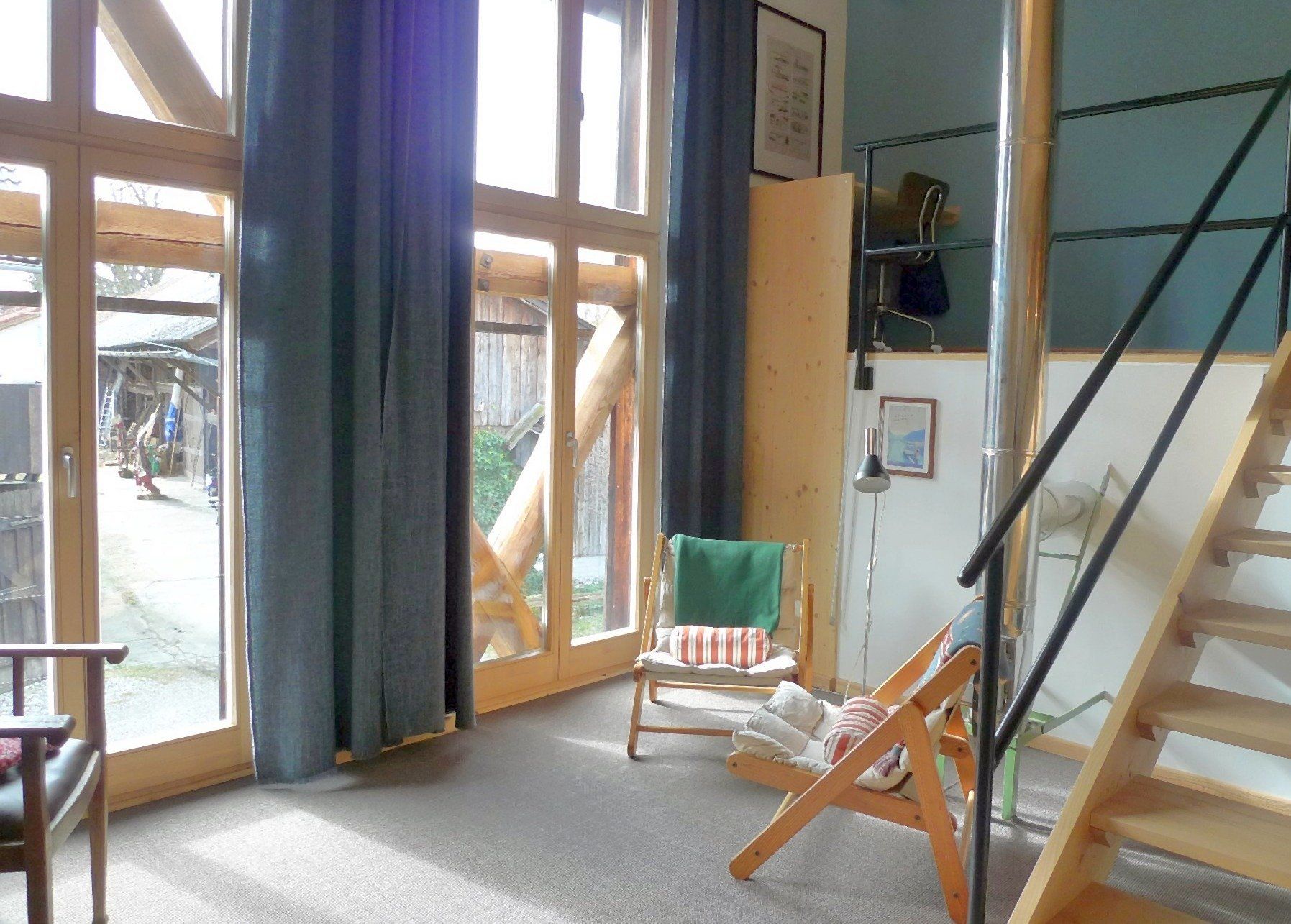 Das Wohnzimmer ist zweigeschossig. Zur Schlafgalerie hoch führt eine offene Treppe.