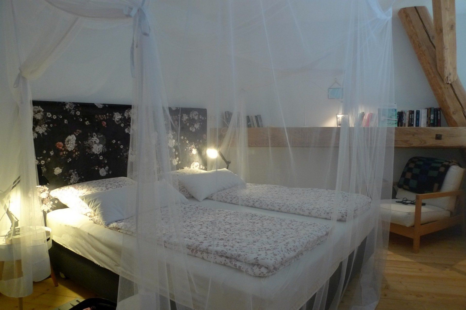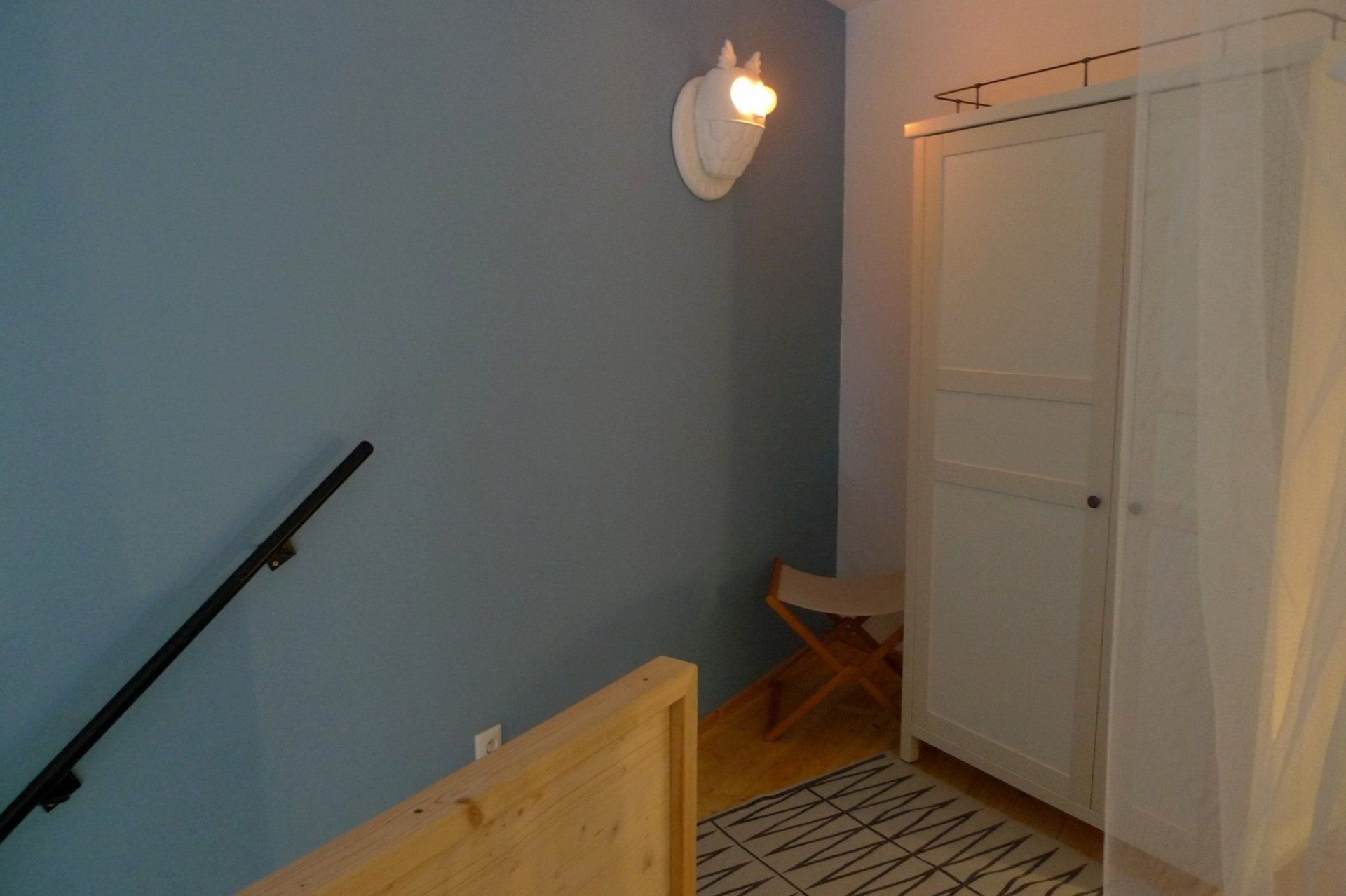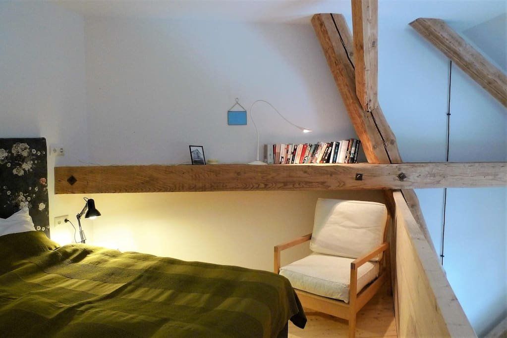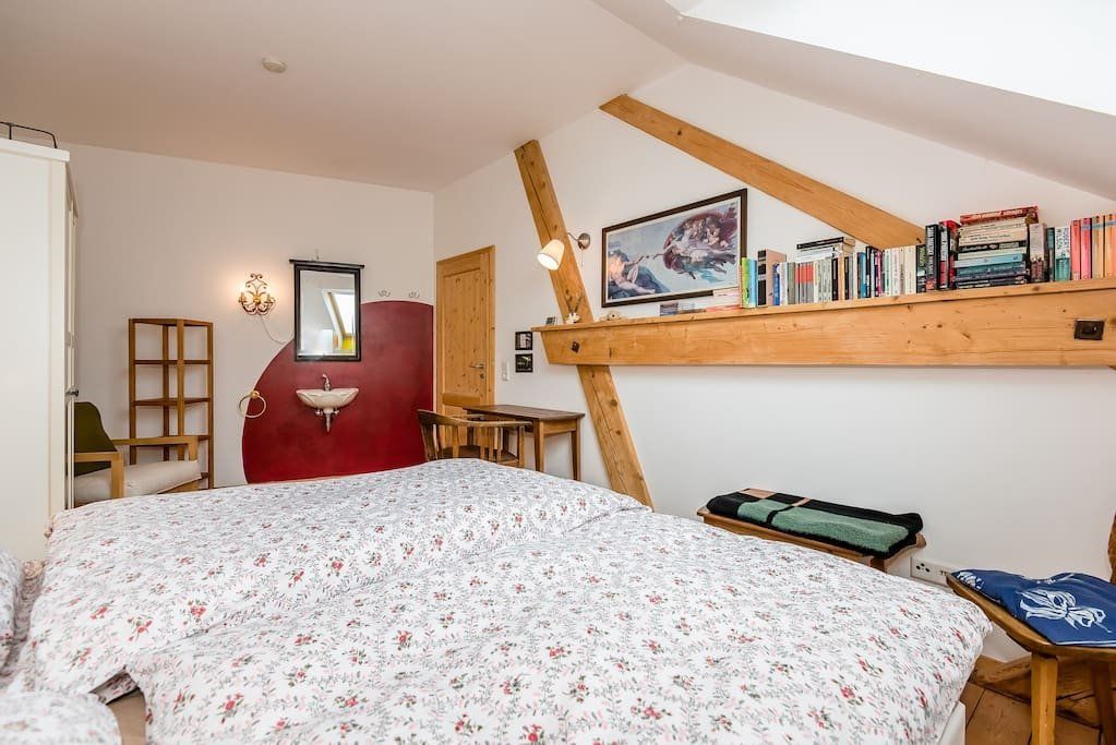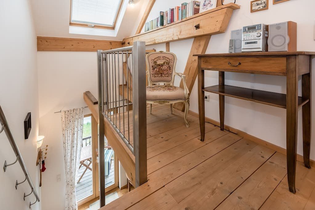Eine etwas steilere Treppe bei und über der Küche führt auf die kleine Galerie und zum abgeschlossenen Schlafzimmer. Hier finden Sie