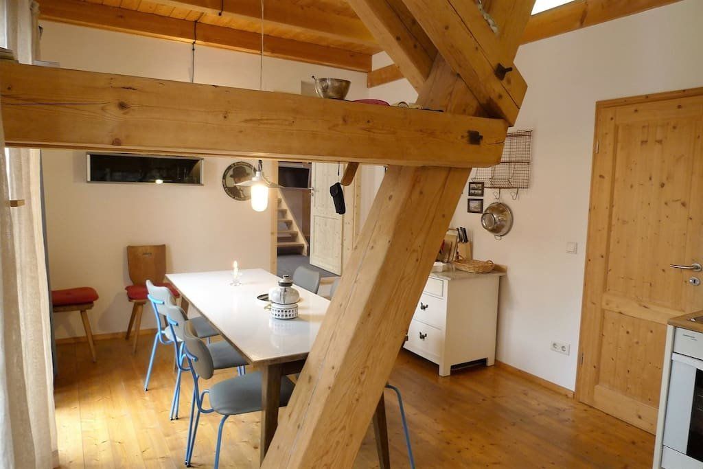 Der Essbereich ist von der Küche durch ein altes Sprengwerk (Balkenkonstrukt) optisch getrennt.