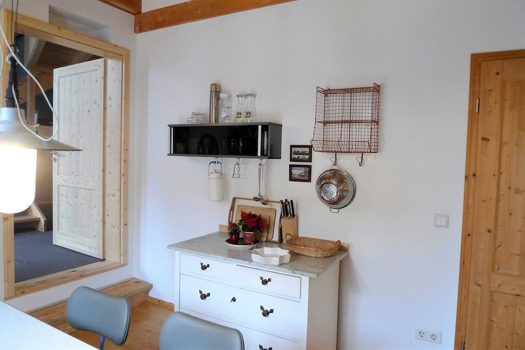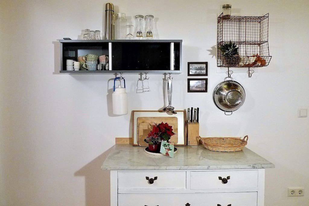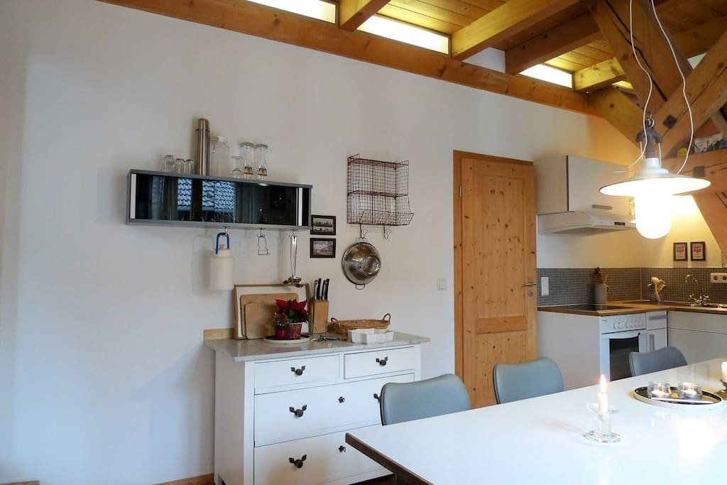 - Die Küche ist vollständig eingerichtet, mit Kühlschrank, Kaffeemaschine, Toaster, Wasserkocher, Backofen/Herd (Ceranfeld), Dunstabzug und Spüle. Geschirr ist ausreichend für 8 Personen vorhanden. Es gibt einen großen Esstisch für 6 - 8 Personen.