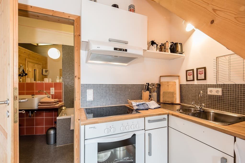Die Küche ist vollständig eingerichtet, mit Kühlschrank, Kaffeemaschine, Toaster, Wasserkocher, Backofen/Herd (Ceranfeld), Dunstabzug und Spüle. Geschirr ist ausreichend für bis zu 8 Personen vorhanden.