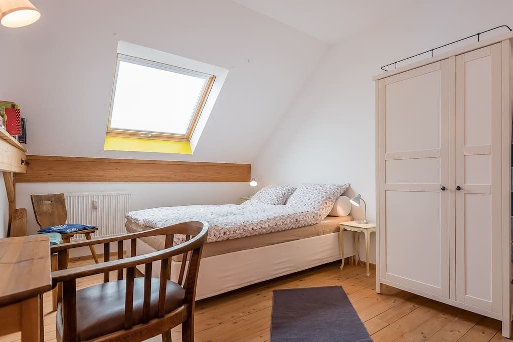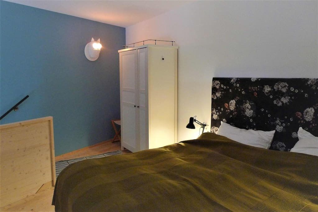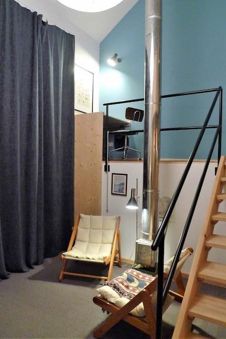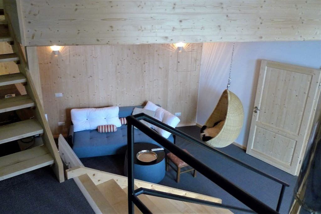 Auf der Galerieebene über dem Wohnraum steht ein Doppelbett (180 breit ). Es gibt hier eine Sitzgelegenheit und eine Kleiderschrank.
