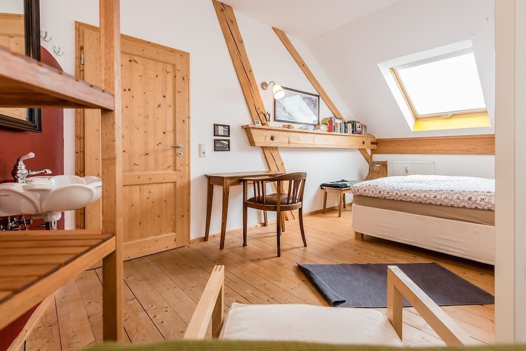 2 Einzelbetten (jeweils 90 cm), die zusammengestellt werden können, zudem einen Schreibplatz und ein kleines Waschbecken.