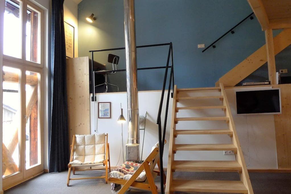 Originell und platzsparend befindet sich die Küchenzeile unter der Treppe zur kleinen zweiten Galerie.
